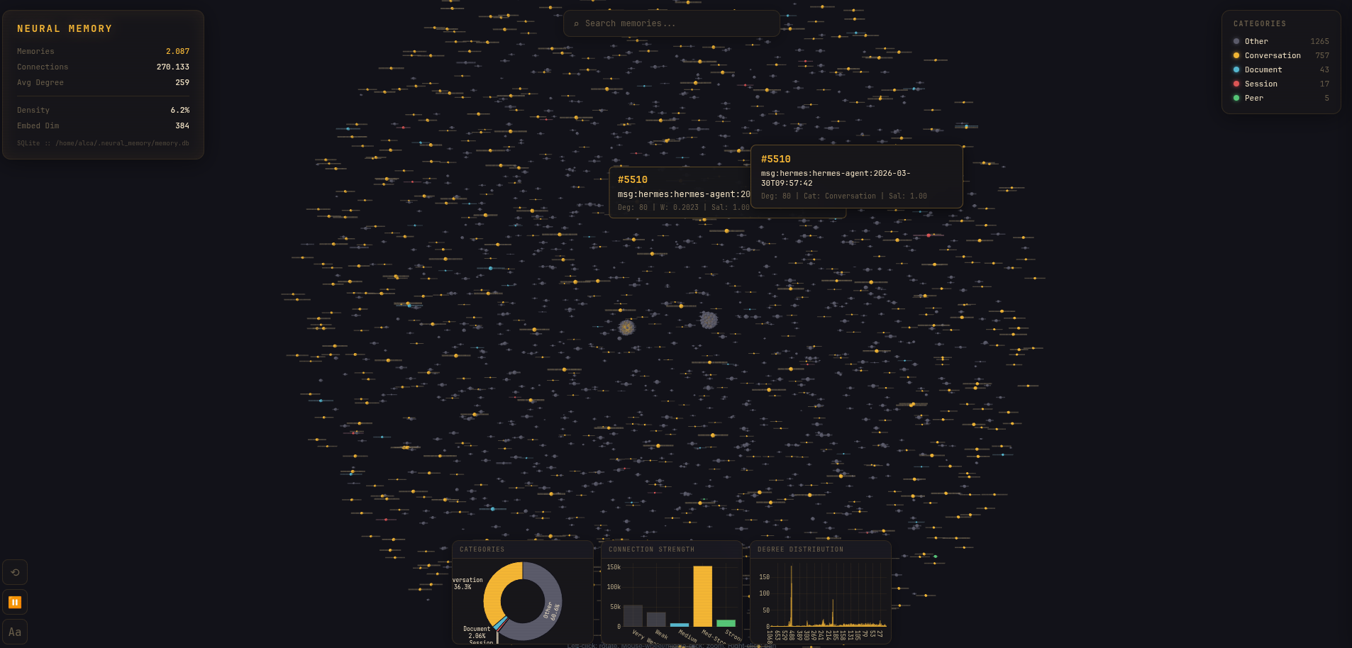 3D Force Graph — WebSocket live updates — Amber theme — Category filtering — Search